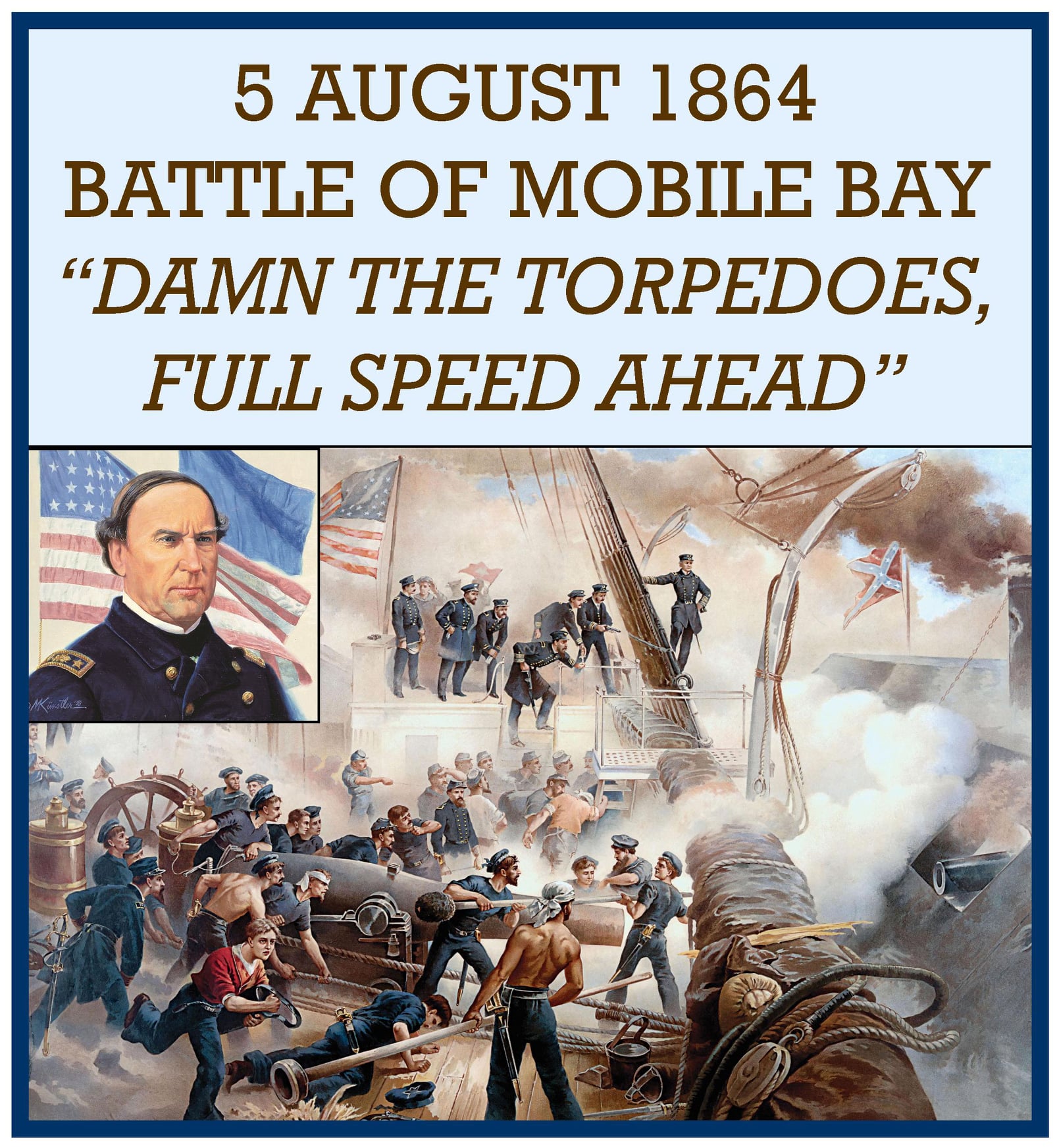 The Battle of Mobile Bay of August 5, 1864, was an engagement of the American Civil War in which a Union fleet commanded by Rear Admiral David G. Farragut, assisted by a contingent of soldiers, attacked a smaller Confederate fleet led by Admiral Franklin Buchanan and three forts that guarded the entrance to Mobile Bay. Farragut’s order of “Damn the torpedoes! Four bells. Captain Drayton, go ahead! Jouett, full speed!” became famous in paraphrase, as “Damn the torpedoes, full speed ahead!”