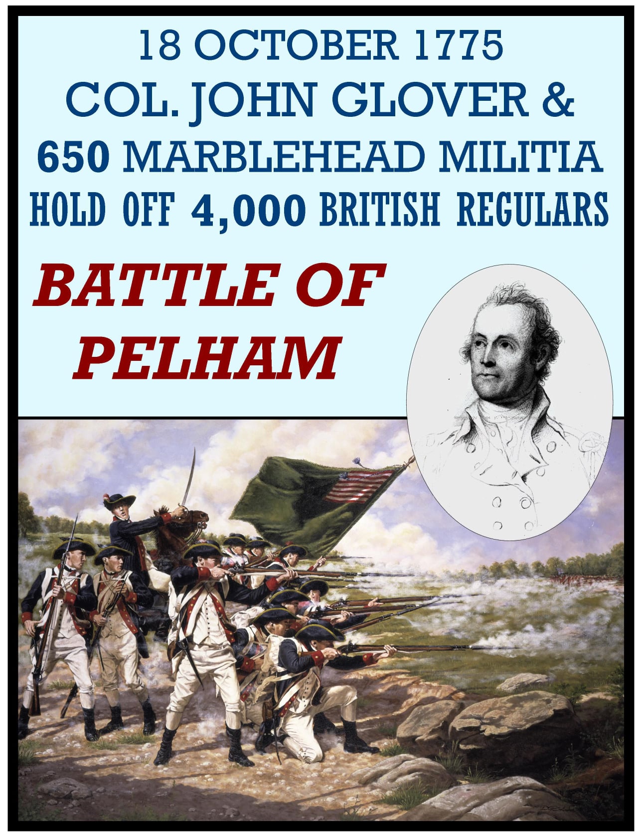 On October 12, British forces landed at Throgs Neck in order to execute a flanking maneuver that would trap Gen. George Washington, commander-in-chief of the American revolutionary forces, and the main body of the Continental Army on the island of Manhattan. The Americans thwarted the landing, and Gen. Sir William Howe, commander-in-chief of British forces in North America, looked for another location along Long Island Sound to disembark his troops. On October 18, he landed 4,000 men at Pelham, 3 miles north of Throgs Neck. Inland were 750 men of a brigade under the command of the American Col. John Glover. Glover positioned his troops behind a series of stone walls and attacked the British advance units. As the British overran each position, the American troops fell back and reorganized behind the next wall. After several such attacks, the British broke off, and the Americans retreated.