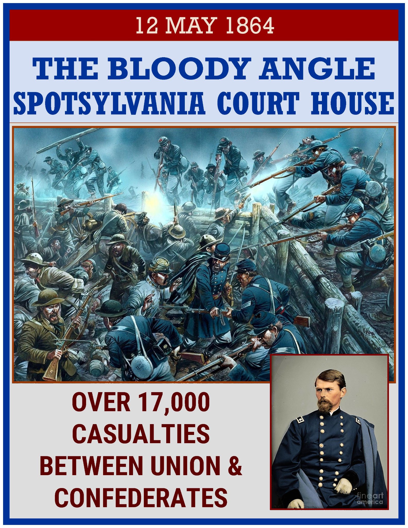 By May 12, the Confederates had established a line of earthworks from Laurel Hill to the Fredericksburg Road. Seeing the merit in Emory Upton’s earlier attack, Grant massed 20,000 men of Maj. Gen. Winfield Hancockâs II Corps opposite the tip of the âmule shoeâ salient in Leeâs line. Lee noted the Federal movement, but mistakenly believing that Grant was withdrawing, removed his artillery from the area. When Hancock’s men advanced that morning, they briefly broke through the Confederate infantry line. Lee sent in reinforcements just as Grant hurled more troops at the Confederate works and Burnsideâs IX Corps attacked from the east. Fighting devolved into a hand-to-hand, point-blank slugfest which lasted for nearly 20 hours and claimed roughly 17,000 casualties; one of the bloodiest attacks of the entire war. Union soldiers described the carnage as a âpanoply of horror,â a âpandemonium of terrorâ and a âliteral saturnalia of blood.â One Federal soldier described the scene as âa Golgothaâ â a place of skulls. âI have, as you know, been in a good many hard fights, but I never saw anything like the contest,â wrote one Louisiana soldier. After the attack, the âmule shoeâ salient became known for all time as the Bloody Angle.