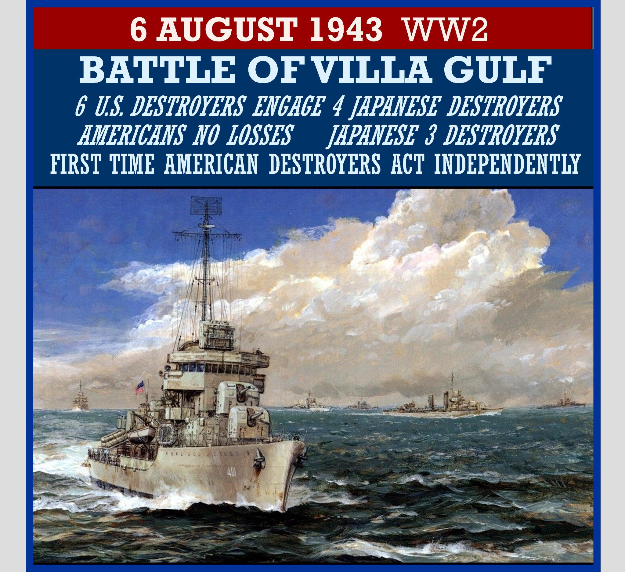 This engagement was the first time that American destroyers were allowed to operate independently of the American cruiser force during the Pacific campaign. In the battle, six American destroyers engaged four Japanese destroyers attempting to reinforce Japanese troops on Kolombangara. The American warships closed the Japanese force undetected with the aid of radar and fired torpedoes, sinking three Japanese destroyers with no damage to American ships.