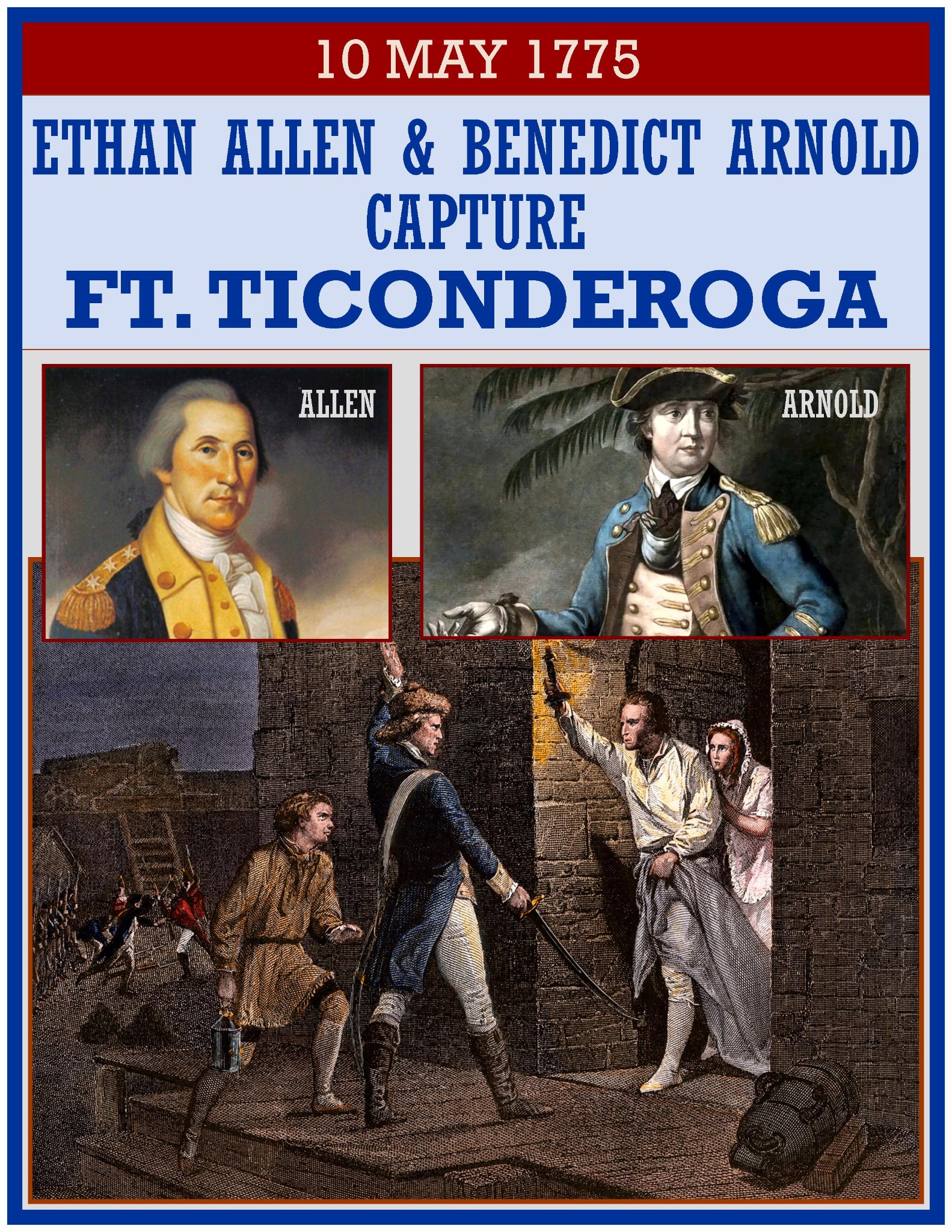 The capture of Fort Ticonderoga occurred during the American Revolutionary War on May 10, 1775, when a small force of Green Mountain Boys led by Ethan Allen and Colonel Benedict Arnold surprised and captured the fort’s small British garrison. The cannons and other armaments at Fort Ticonderoga were later transported to Boston by Colonel Henry Knox in the noble train of artillery and used to fortify Dorchester Heights and break the standoff at the siege of Boston.