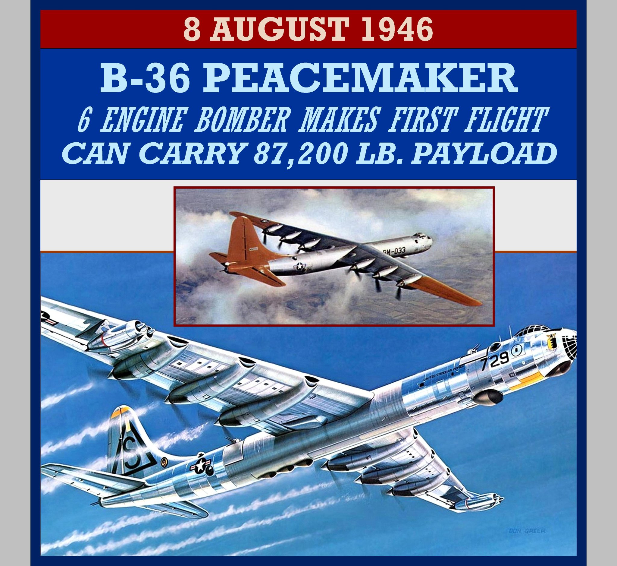 The Convair B-36 “Peacemaker”[N 1] is a strategic bomber that was built by Convair and operated by the United States Air Force (USAF) from 1949 to 1959. The B-36 is the largest mass-produced piston-engined aircraft ever built. It had the longest wingspan of any combat aircraft ever built, at 230 ft. The B-36 was the first bomber capable of delivering any of the nuclear weapons in the U.S. arsenal from inside its four bomb bays without aircraft modifications. With a range of 10,000 mi and a maximum payload of 87,200 lb, the B-36 was capable of intercontinental flight without refuelling.