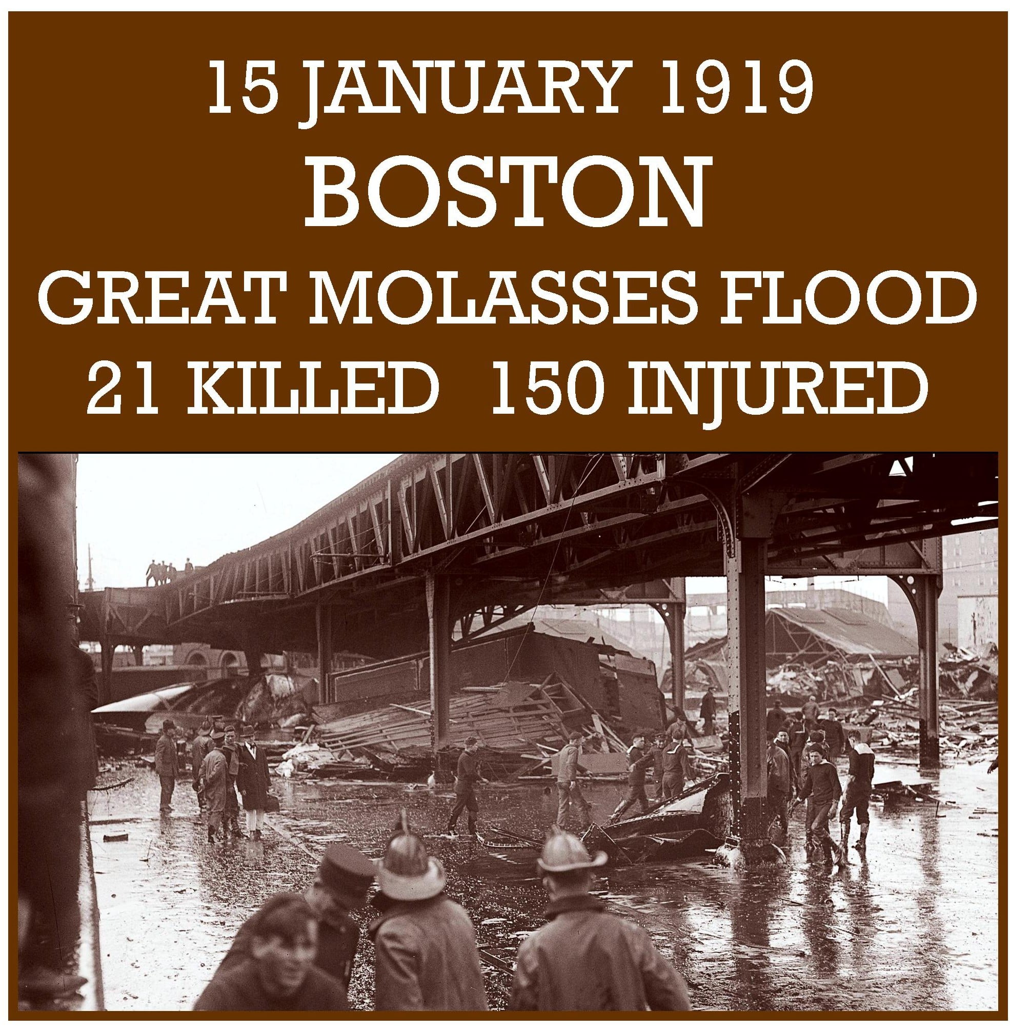 The Great Molasses Flood, also known as the Boston Molasses Disaster or the Great Boston Molasses Flood, occurred on January 15, 1919, in the North End neighborhood of Boston, Massachusetts. A 50 foot high storage tank filled with 2.3 million US gal weighing approximately 12,000 tons of molasses burst, and the resultant wave of molasses rushed through the streets at an estimated 35 mph, killing 21 and injuring 150. rochestermilitary.com