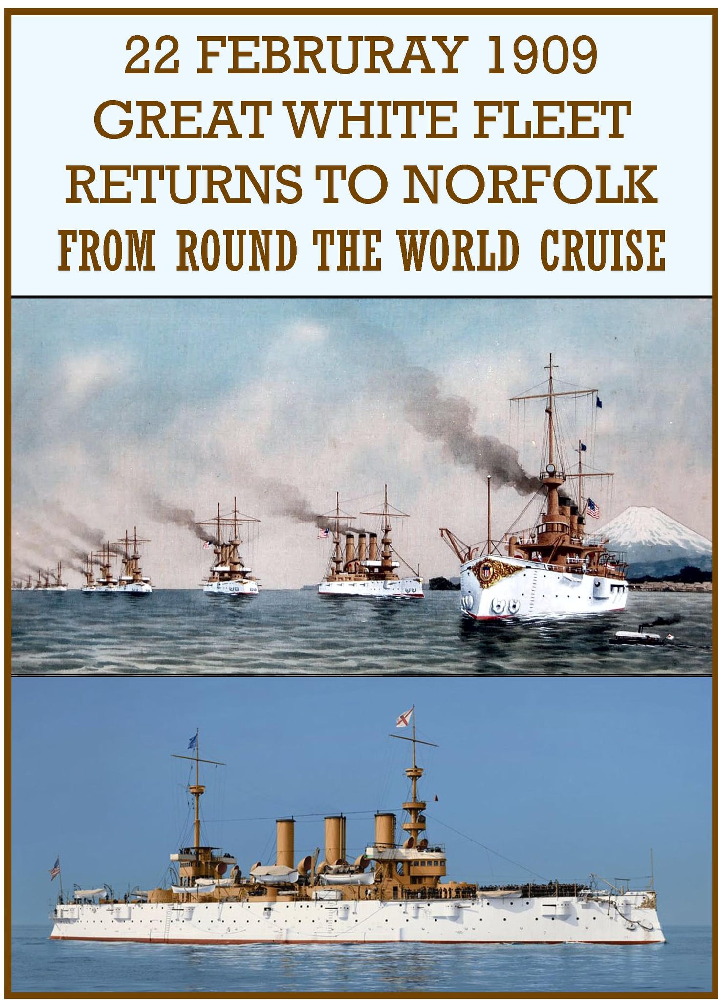 The Great White Fleet was the popular nickname for the group of United States Navy battleships which completed a journey around the globe from December 16, 1907 to February 22, 1909 by order of United States President Theodore Roosevelt. Its mission was to make friendly courtesy visits to numerous countries while displaying new U.S. naval power to the world. The hulls of these ships were painted a stark white, giving the armada its nickname. It consisted of 16 battleships divided into two squadrons, along with various escorts.