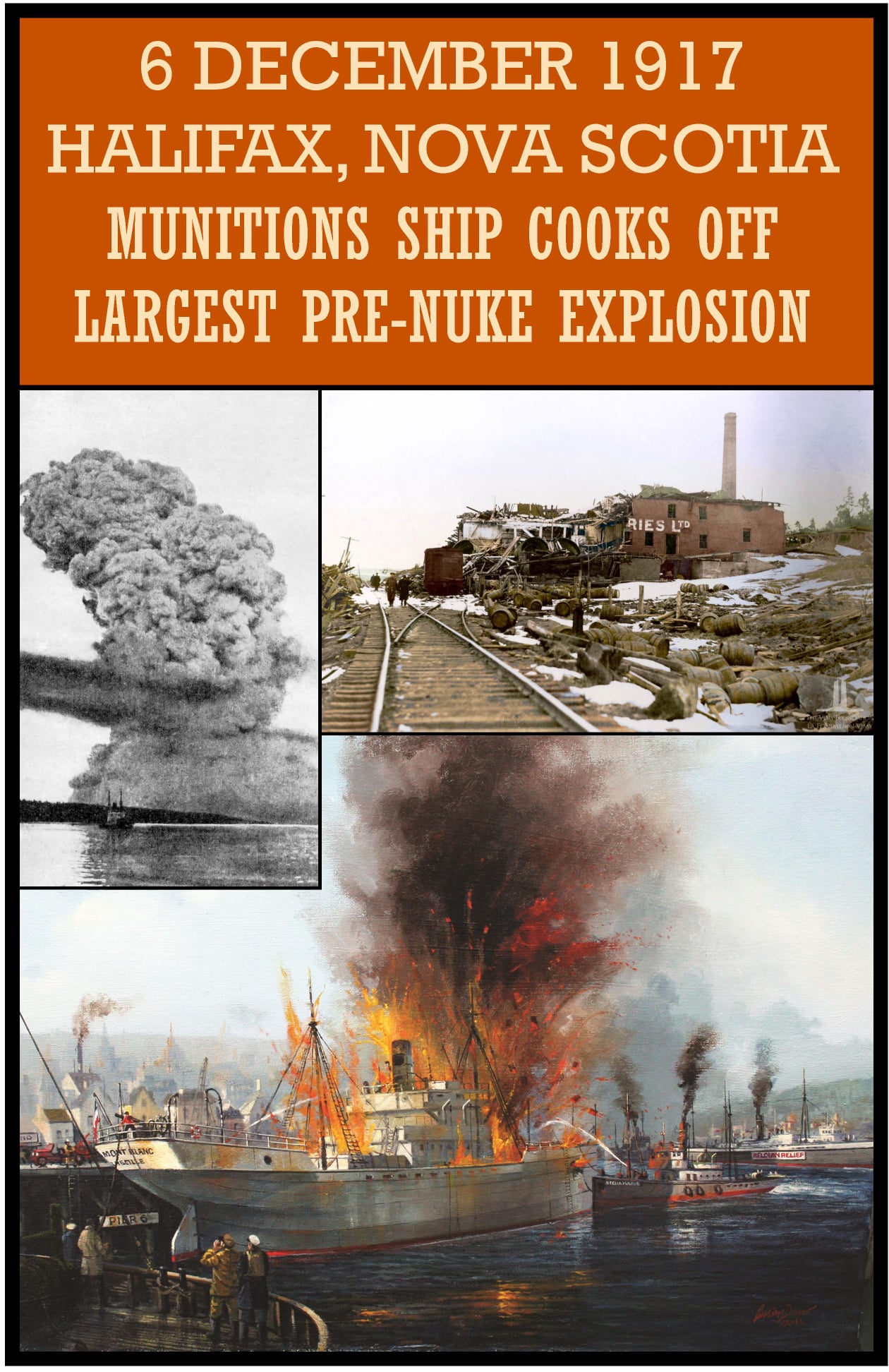 The Halifax Explosion was a disaster that occurred in Halifax, Nova Scotia, Canada, on the morning of 6 December 1917. SS Mont-Blanc, a French cargo ship laden with high explosives, collided with the Norwegian vessel SS Imo in the Narrows, a strait connecting the upper Halifax Harbour to Bedford Basin. A fire on board the Mont-Blanc led to a massive explosion that devastated the Richmond district of Halifax. Approximately 2,000 people were killed, largely in Halifax and Dartmouth, by the blast, debris, fires, or collapsed buildings, and an estimated 9,000 others were injured. The blast was the largest human-made explosion at the time, releasing the equivalent energy of roughly 2.9 kilotons of TNT.
