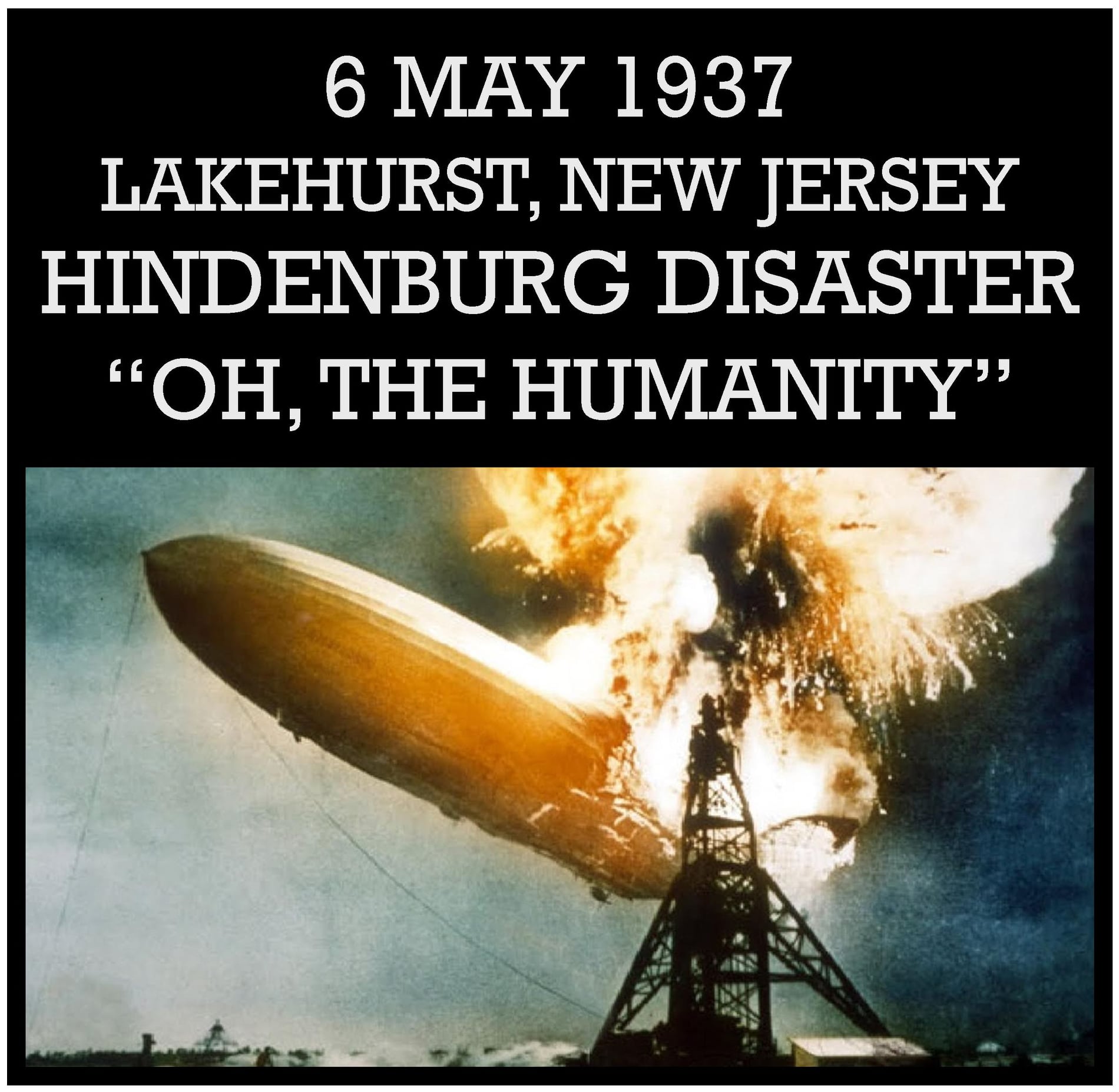 The Hindenburg Disaster – “Oh, the Humanity!” May 6, 1937 The Hindenburg Disaster – “Oh, the Humanity!” News reporter Herbert Morrison makes his famous proclamation, “Oh, the Humanity!” as he witnesses the disaster unfolding. The giant airship Hindenburg explodes and burns killing 36 people while preparing to land at Lakehurst, New Jersey. The exact cause of the fire has never been determined, but theories range from a hydrogen leak, sabotage from either crew or passengers, static electricity, and a flammable coating on the skin of the craft. This disaster marked the end of the airship era.