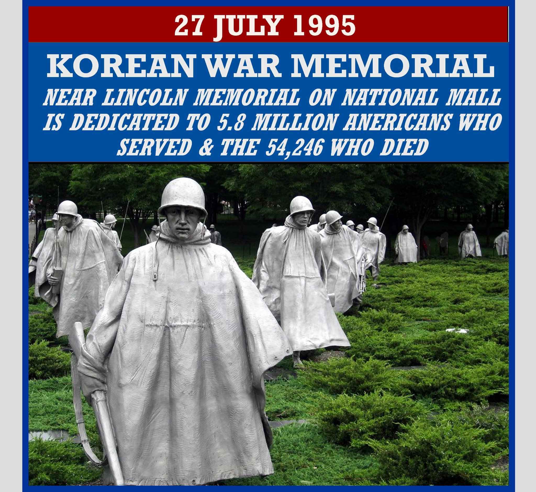 The Korean War Veterans Memorial is located near the Lincoln Memorial on the National Mall in Washington, D.C. It was dedicated on July 27, 1995. The memorial commemorates the sacrifices of the 5.8 million Americans who served in the U.S. armed services during the three-year period of the Korean War. From June 25, 1950 to July 27, 1953, 54,246 Americans died in support of their country. Of these, 8,200 were listed as missing in action, or lost or buried at sea at the Honolulu Memorial, at the time of the Korean War Courts of the Missing dedication in 1966. In addition 103,284 were wounded during the conflict. As an integral part of the memorial, the Korean War Honor Roll was established, honoring those U.S. military personnel who died worldwide during the war.