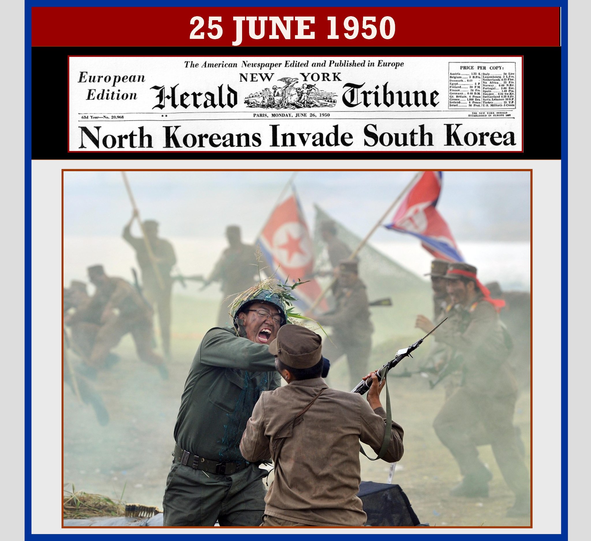 The Korean War was fought between North Korea and South Korea from 1950 to 1953. The war began on 25 June 1950 when North Korea invaded South Korea following clashes along the border and rebellions in South Korea. North Korea was supported by China and the Soviet Union while South Korea was supported by the United Nations, principally the United States. The fighting ended with an armistice on 27 July 1953.