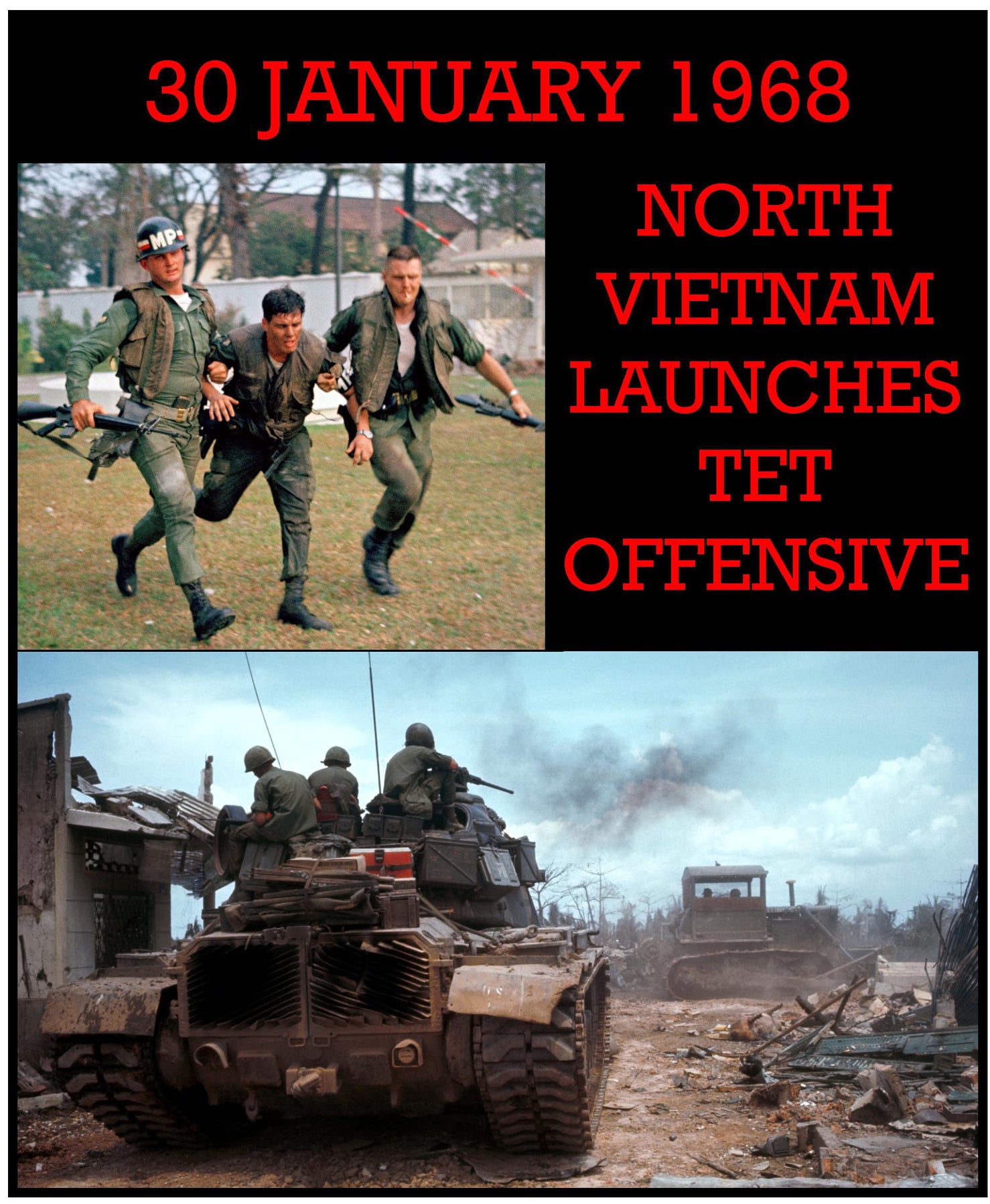 The Tet Offensive (Vietnamese: Sá»± kiện Tết Mậu Thân 1968), or officially called The General Offensive and Uprising of Tet Mau Than 1968 (Vietnamese: Tổng Tiến công và Nổi dậy Tết Mậu Thân 1968) was a major escalation and one of the largest military campaigns of the Vietnam War. It was launched on January 30, 1968 by forces of the Viet Cong (VC) and North Vietnamese People’s Army of Vietnam (PAVN) against the forces of the South Vietnamese Army of the Republic of Vietnam (ARVN), the United States Armed Forces and their allies. It was a campaign of surprise attacks against military and civilian command and control centers throughout South Vietnam. The name of the offensive comes from the Tết holiday, the Vietnamese New Year, when the first major attacks took place. Lasting through February, the offensive was a military defeat for North Vietnam