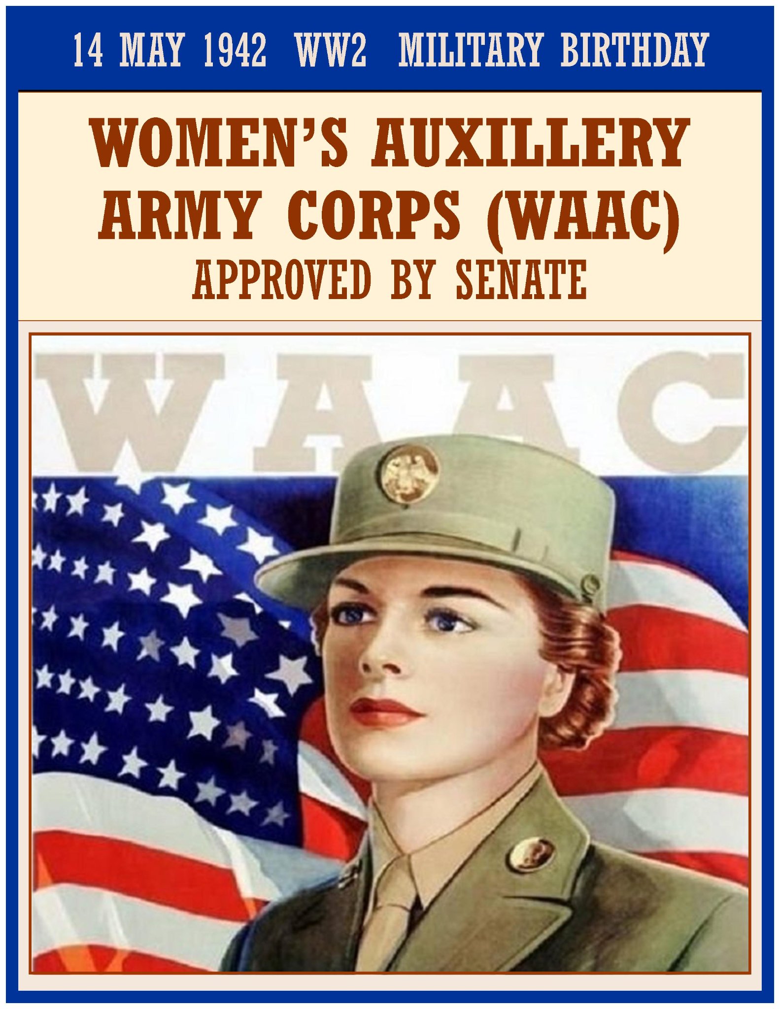 The Women’s Army Corps (WAC) was the women’s branch of the United States Army. It was created as an auxiliary unit, the Women’s Army Auxiliary Corps (WAAC) on 15 May 1942 by and converted to an active duty status in the Army of the United States as the WAC on 1 July 1943. Its first director was Oveta Culp Hobby, a prominent woman in Texas society. The WAC was disbanded in 1978, and all units were integrated with male units