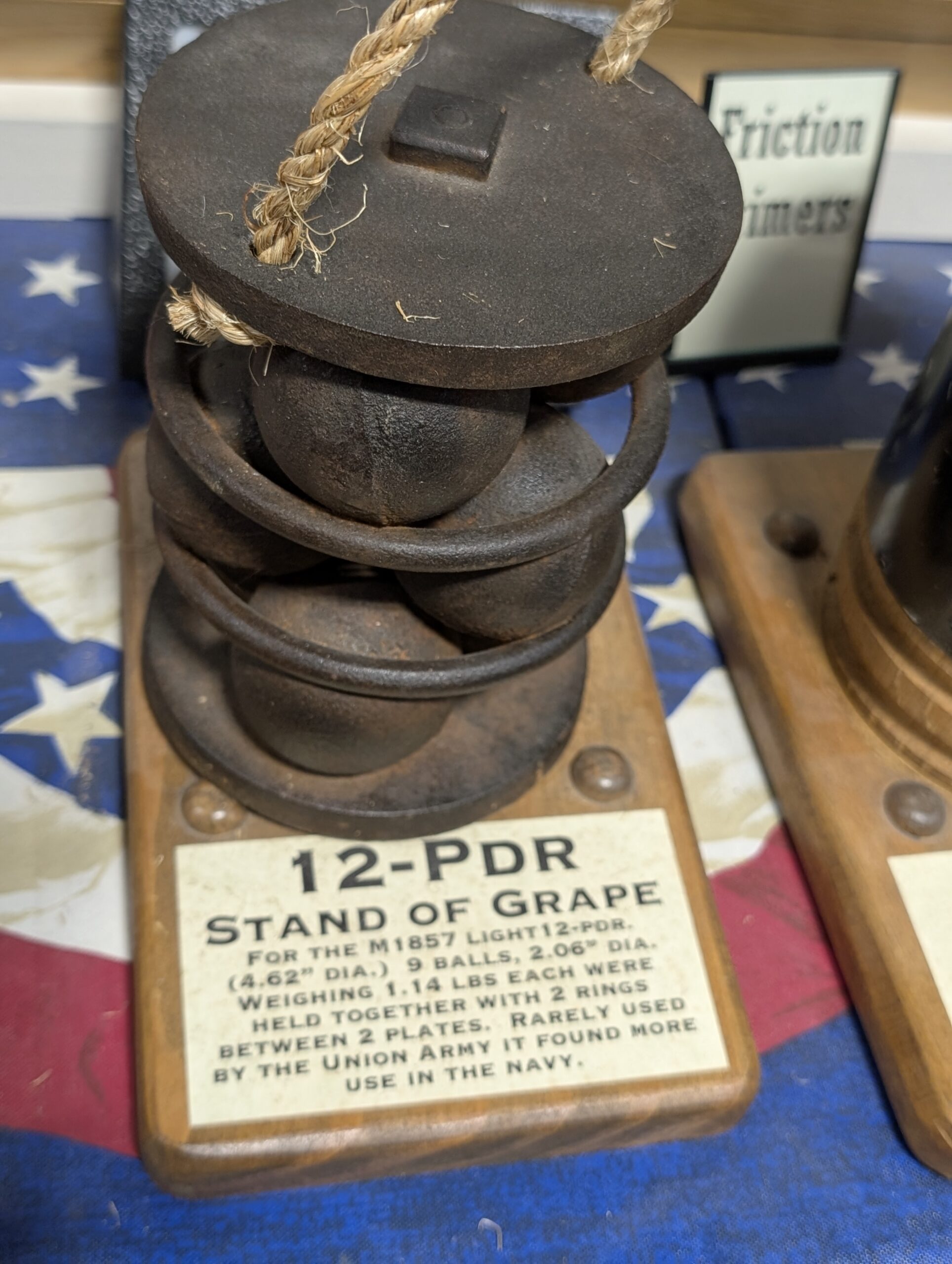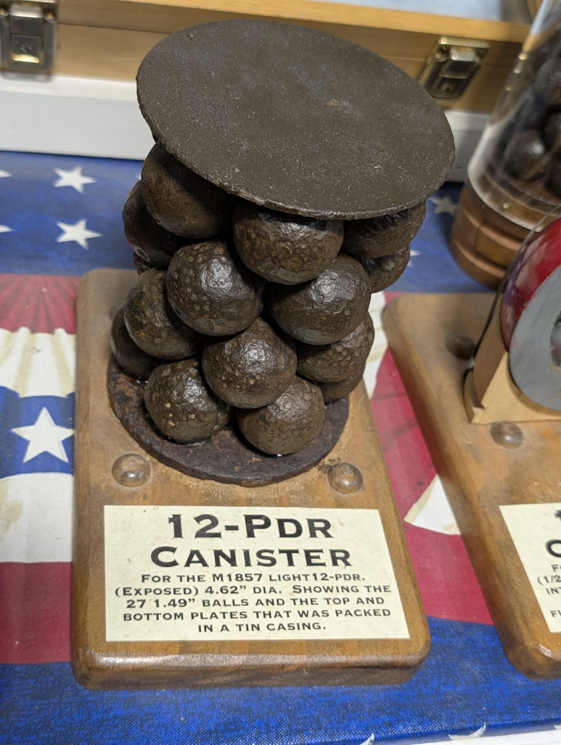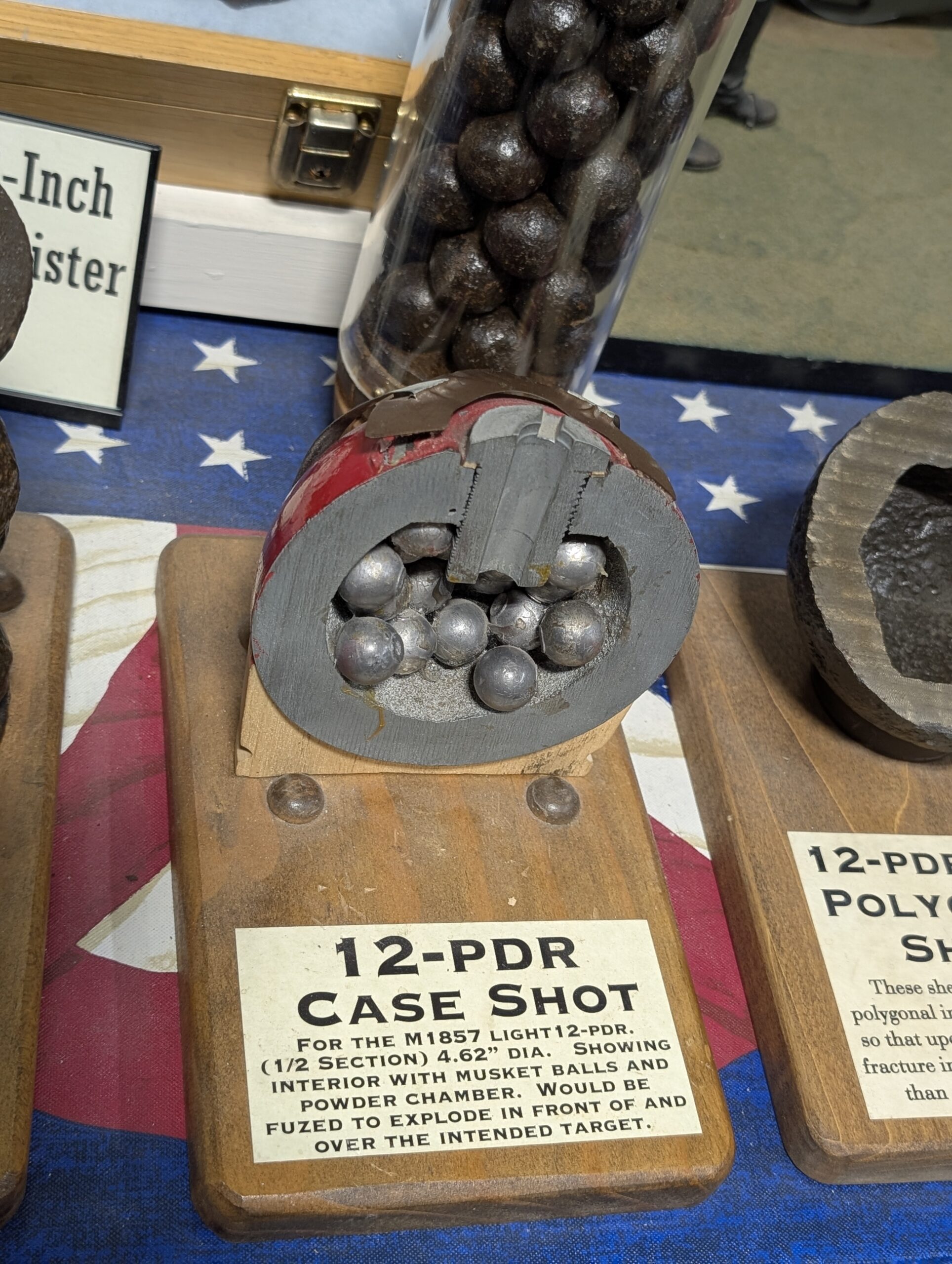 For anti-personnel use at close range, nothing was more feared than canister shot. A tin can filled with iron balls, it turned a cannon into a massive shotgun. Case shot was a more sophisticated version, a hollow shell filled with musket balls and a bursting charge designed to explode over enemy troops. Grapeshot, nine large iron balls arranged on a central stem, was similar in purpose but saw less use by army field artillery during the war.