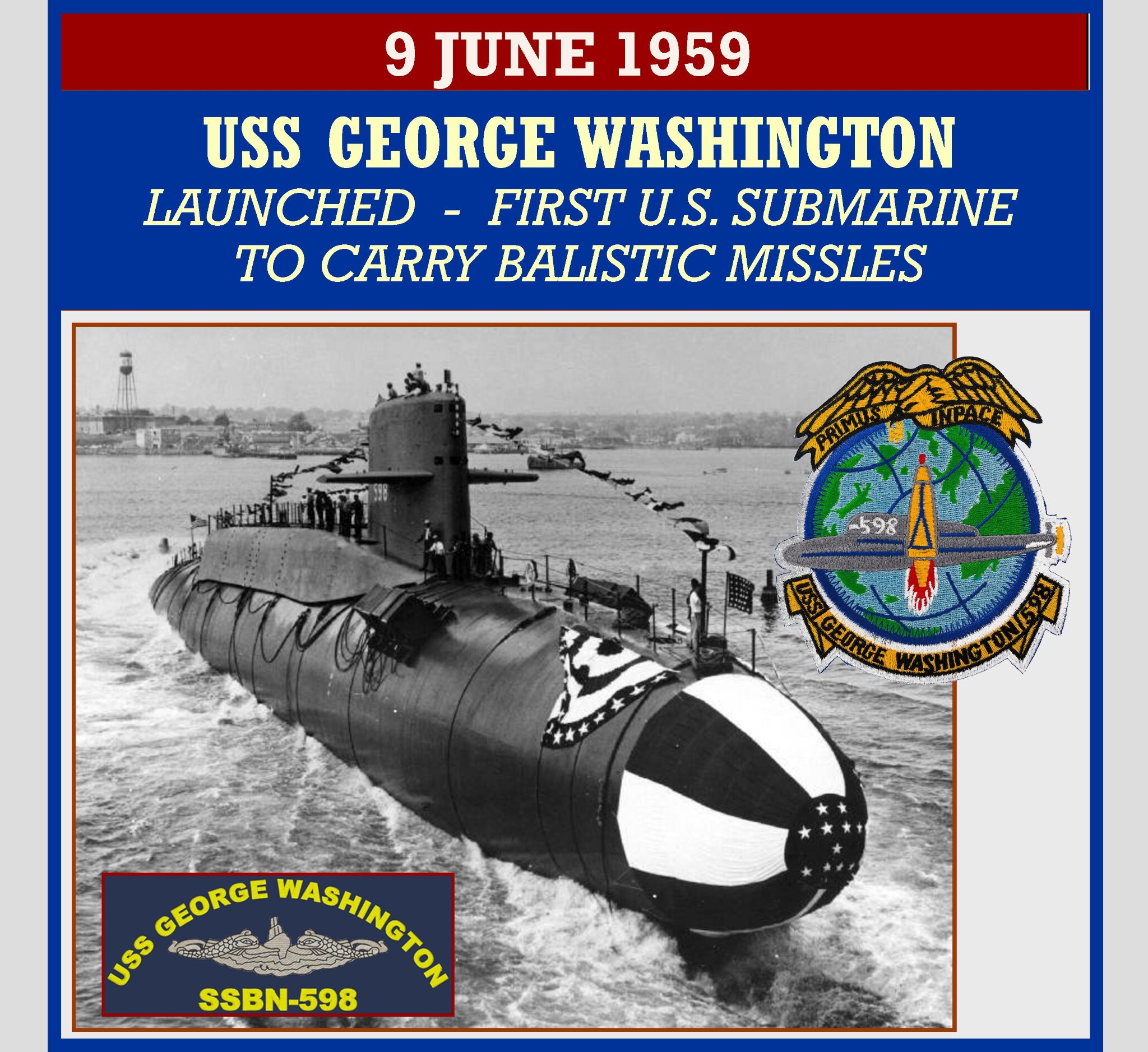 USS George Washington (SSBN-598) was the United States’ first operational ballistic missile submarine. It was the lead ship of her class of nuclear ballistic missile submarines, was the third United States Navy ship of the name, in honor of George Washington (1732â1799), the first President of the United States, and the first of that name to be purpose-built as a warship.