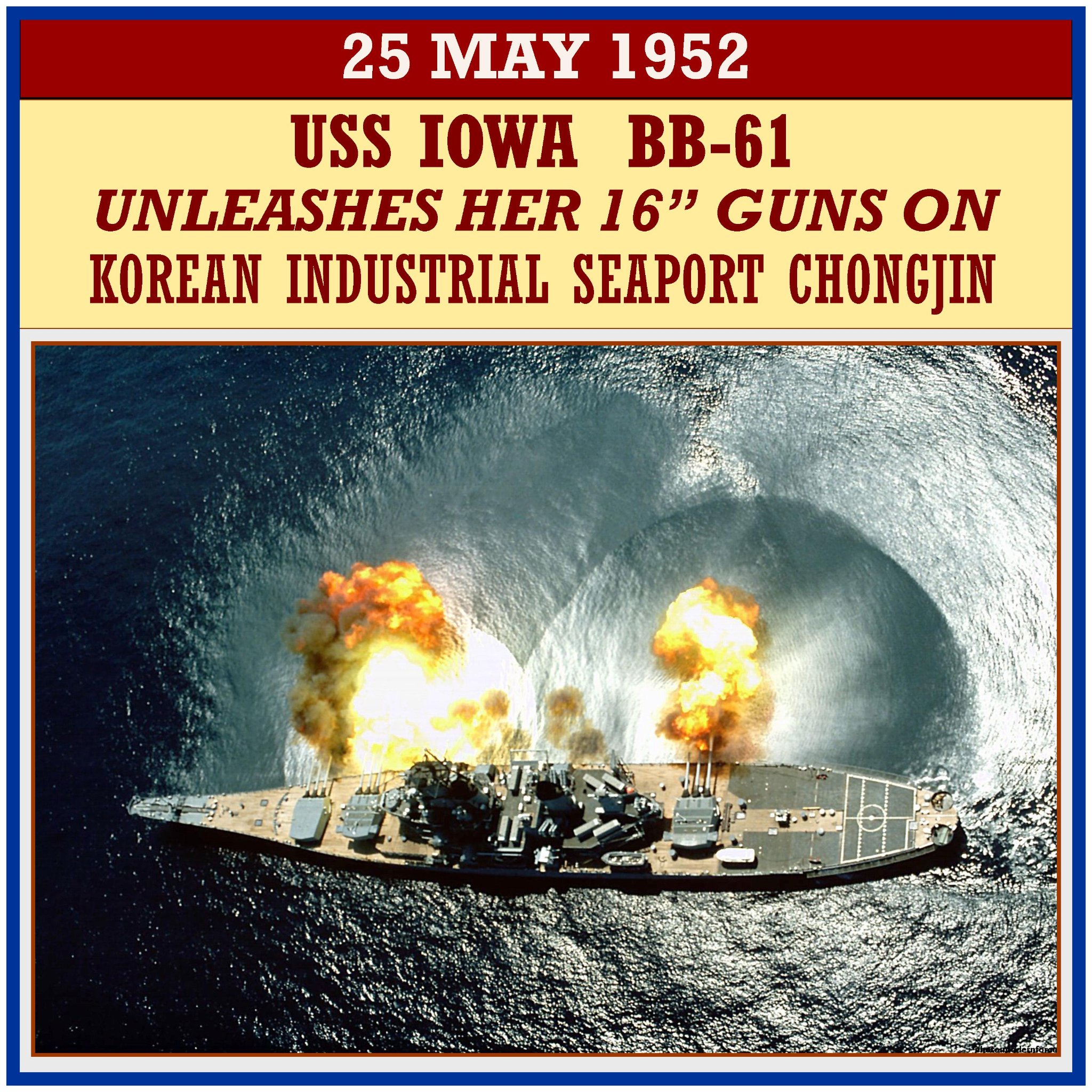 In action against North Korean industrial and rail transportation center at Chongjin. Not since the USS MISSOURI bombarded Chongjin in November 1950, had a battleship operated that far north, just forty-eight miles from the Russian border. The USS IOWA effectively destroyed Chongjinâs industrial center.