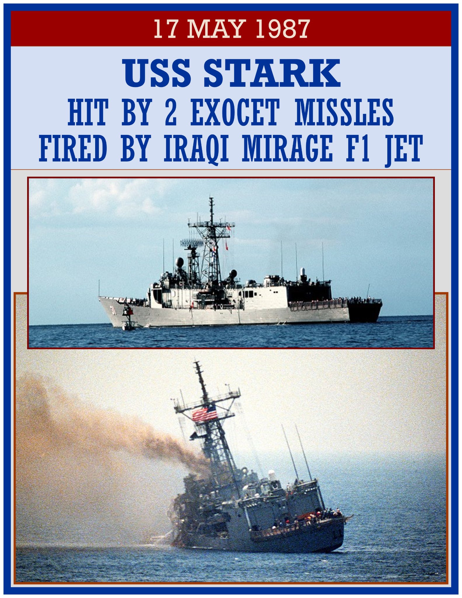 USS Stark was deployed to the Middle East Force in 1984 and 1987. Captain Glenn R. Brindel was the commanding officer during the 1987 deployment. The ship was struck on 17 May 1987 by two Exocet anti-ship missiles during the IranâIraq War fired from an Iraqi aircraft officially identified as a Dassault Mirage F1 fighter, The Reagan administration attributed the blame to Iran for its alleged belligerence in the underlying conflict. The plane had taken off from Shaibah, Iraq at 20:00 and had flown south into the Persian Gulf. The pilot fired the first Exocet missile from a range of 22.5 nautical miles (41.7 km), and the second from 15.5 nautical miles (28.7 km), just about the time Stark issued a standard warning by radio. The frigate did not detect the missiles with radar; warning was given by the lookout only moments before the missiles struck. The first penetrated the port-side hull and failed to detonate, but left flaming rocket fuel in its path. The second entered at almost the same point, and, leaving a 10 by 13 ft. gash, exploded in crew quarters. The missiles killed 37 sailors and injured 21.