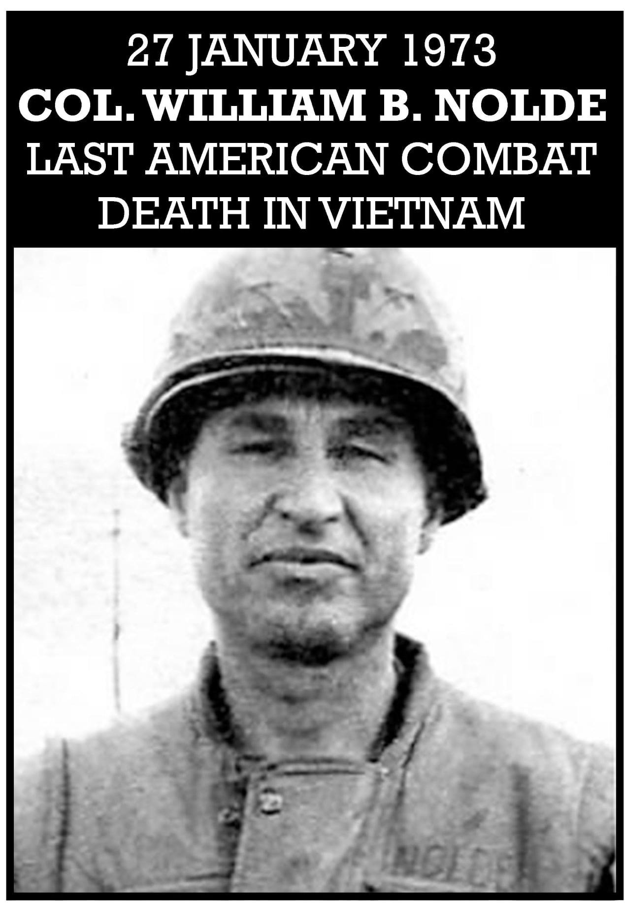 Vietnam War – Last American Combat Casualty January 27, 1973 Col. William B. Nolde is killed by an artillery shell 11 hours before the truce was to take effect. He was the 45,914th confirmed death and 57,597th in the total list of Americans killed during the conflict and is the last official Combat Casualty of the Vietnam War. During his time in service, he earned four medals, including the Bronze Star Medal and Legion of Merit. rochestermilitary.com