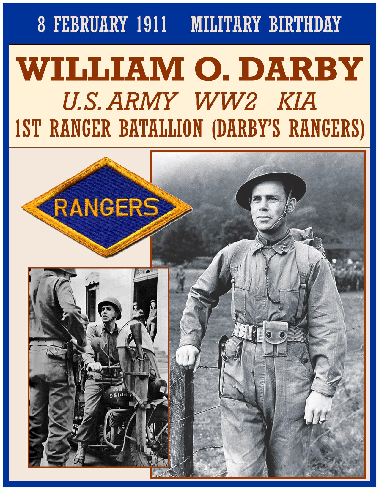 William O. Darby (February 8, 1911 â April 30, 1945) was a career United States Army officer who fought in World War II, where he was killed in action in Italy. He was posthumously promoted to brigadier general. Darby led the famous Darby’s Rangers, which evolved into the United States Army Rangers.