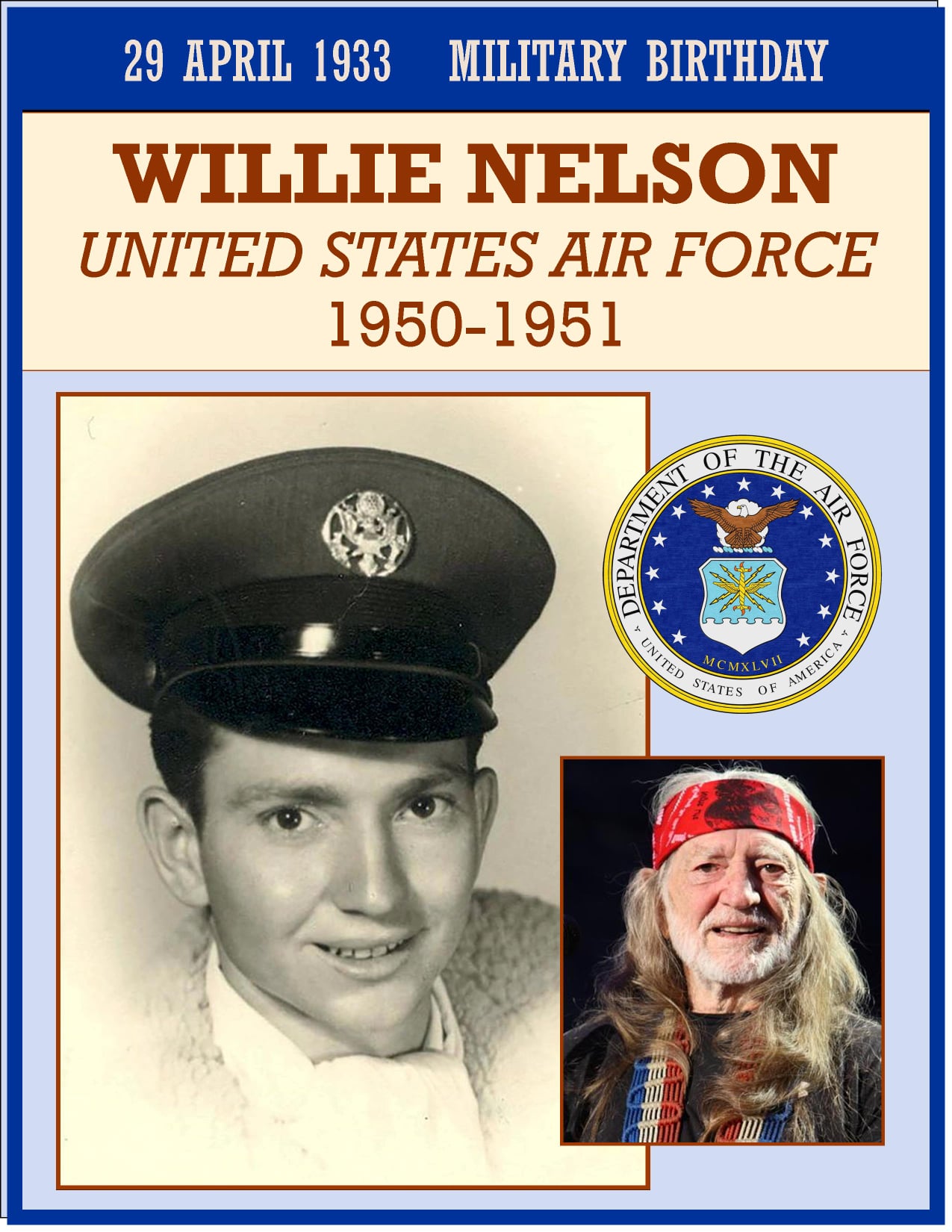 After graduating high school, young Willie Nelson voluntarily joined the Air Force. In the midst of the Korean War, Willie enlisted hoping to be a jet pilot. He received his first basic training at Lackland Air Force Base in San Antonio, but it was concluded Willie was too âabsentmindedâ (as Willie puts it) to be in the cockpit of a jet. So the Air Force shipped him to Shepherd Air Force Base in Wichita Falls, TX, and eventually to Scott Air Force Base in Illinois for more basic training.